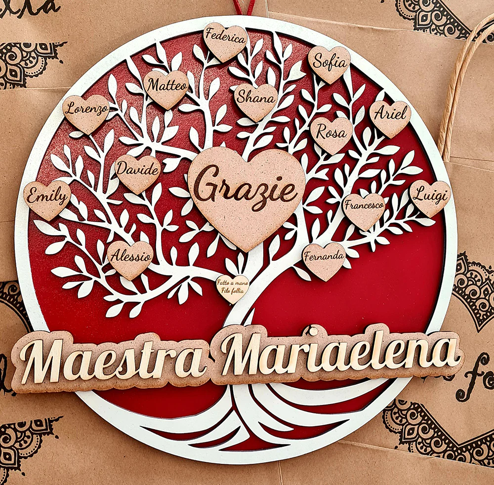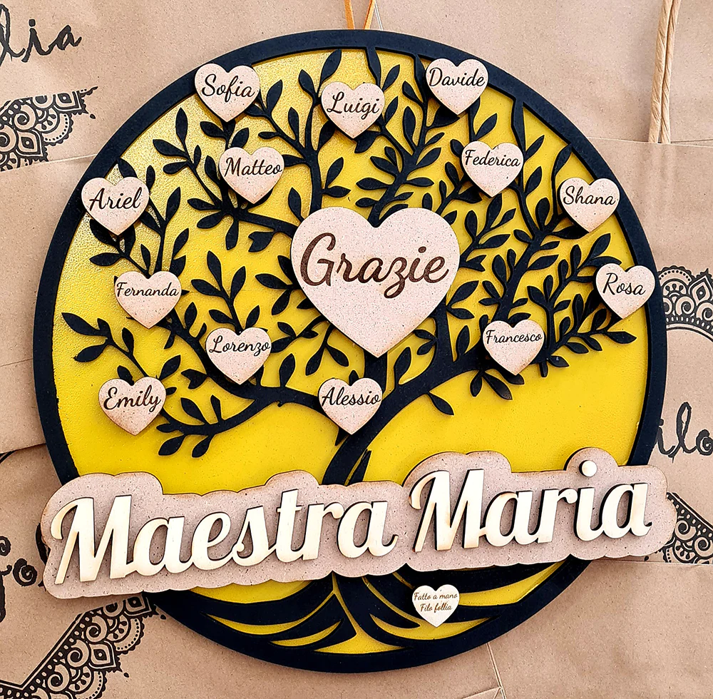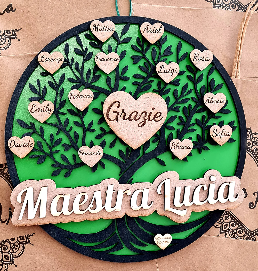 Quadro rotondo di circa 30 cm in legno con base d’appoggio inclusa. Un regalo unico con i nomi di tutti i bambini per le maestre.