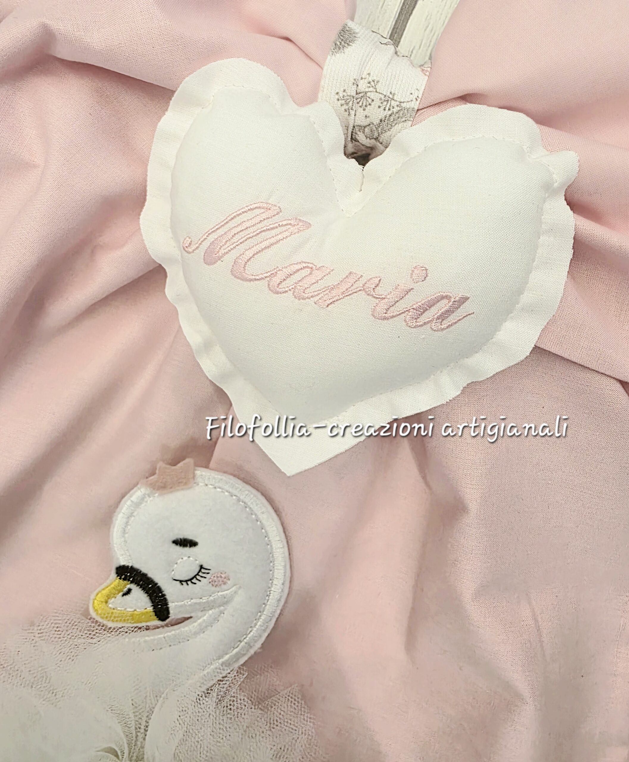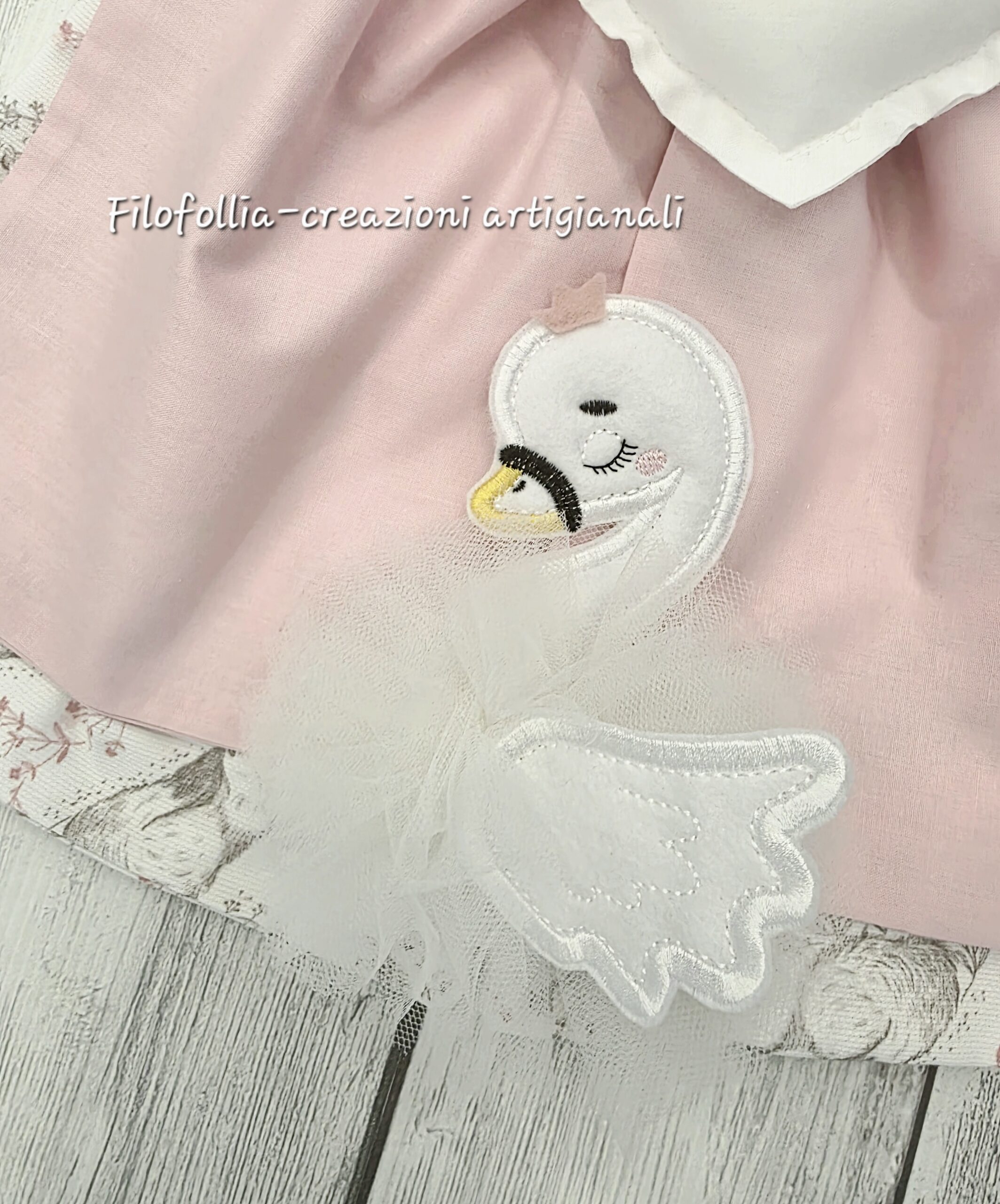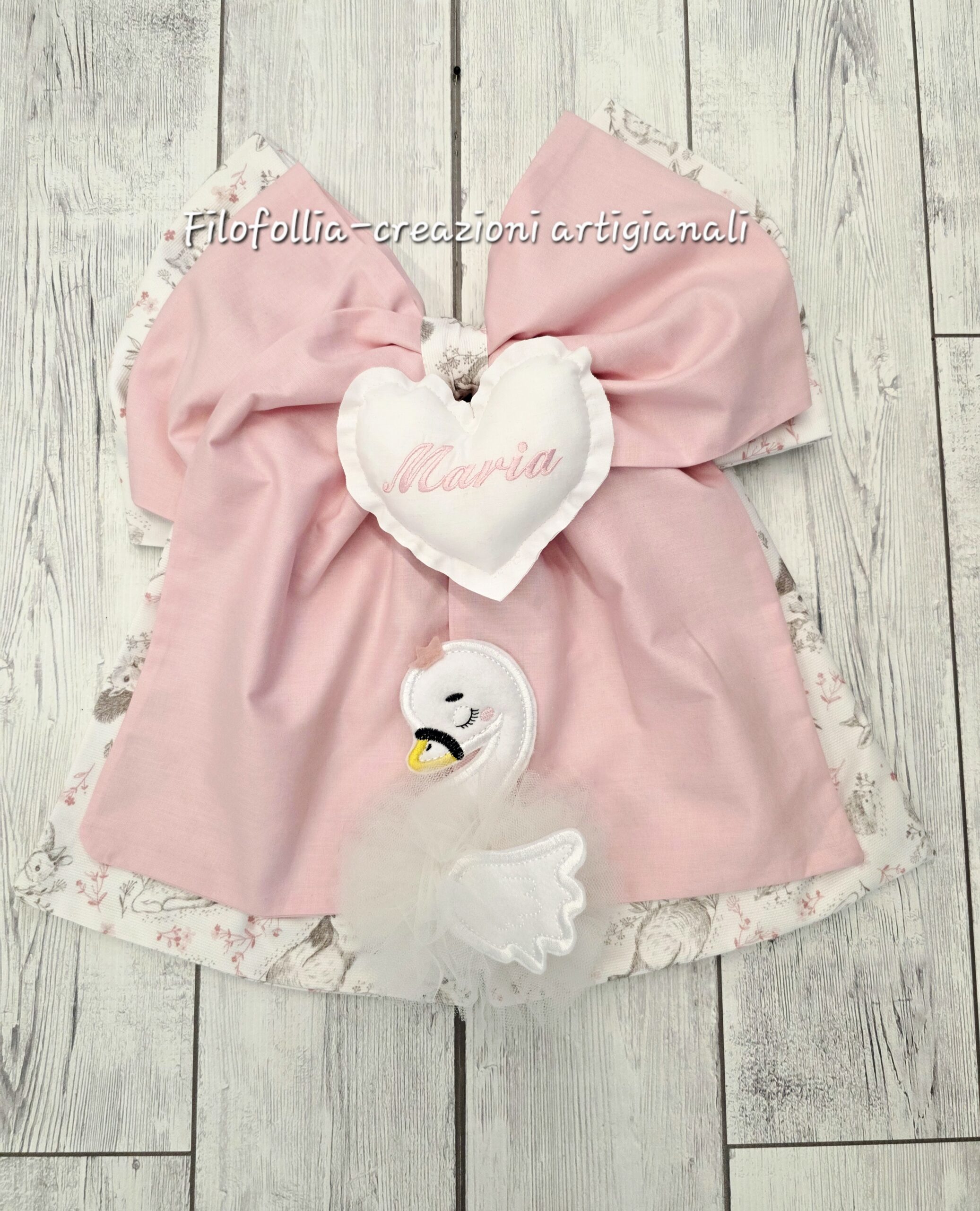 FIOCCO NASCITA composto da due strati di tessuto Rosa e fantasia a tema nature per un effetto voluminoso e raffinato. L’applicazione centrale del cigno è rifinita con un soffice tulle che simula le piume e aggiunge un meraviglioso effetto 3D. Al centro un cuore ricamato con il nome della tua bambina. Creazione 100% handmade con tessuti in 100% cotone. Ideale un annuncio di nascita delicato e raffinato e da riutilizzare come decorazione per la cameretta.