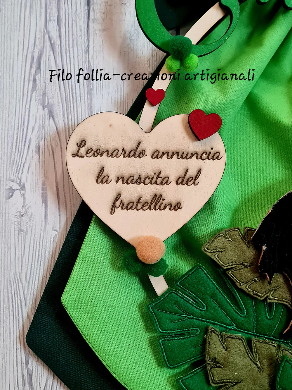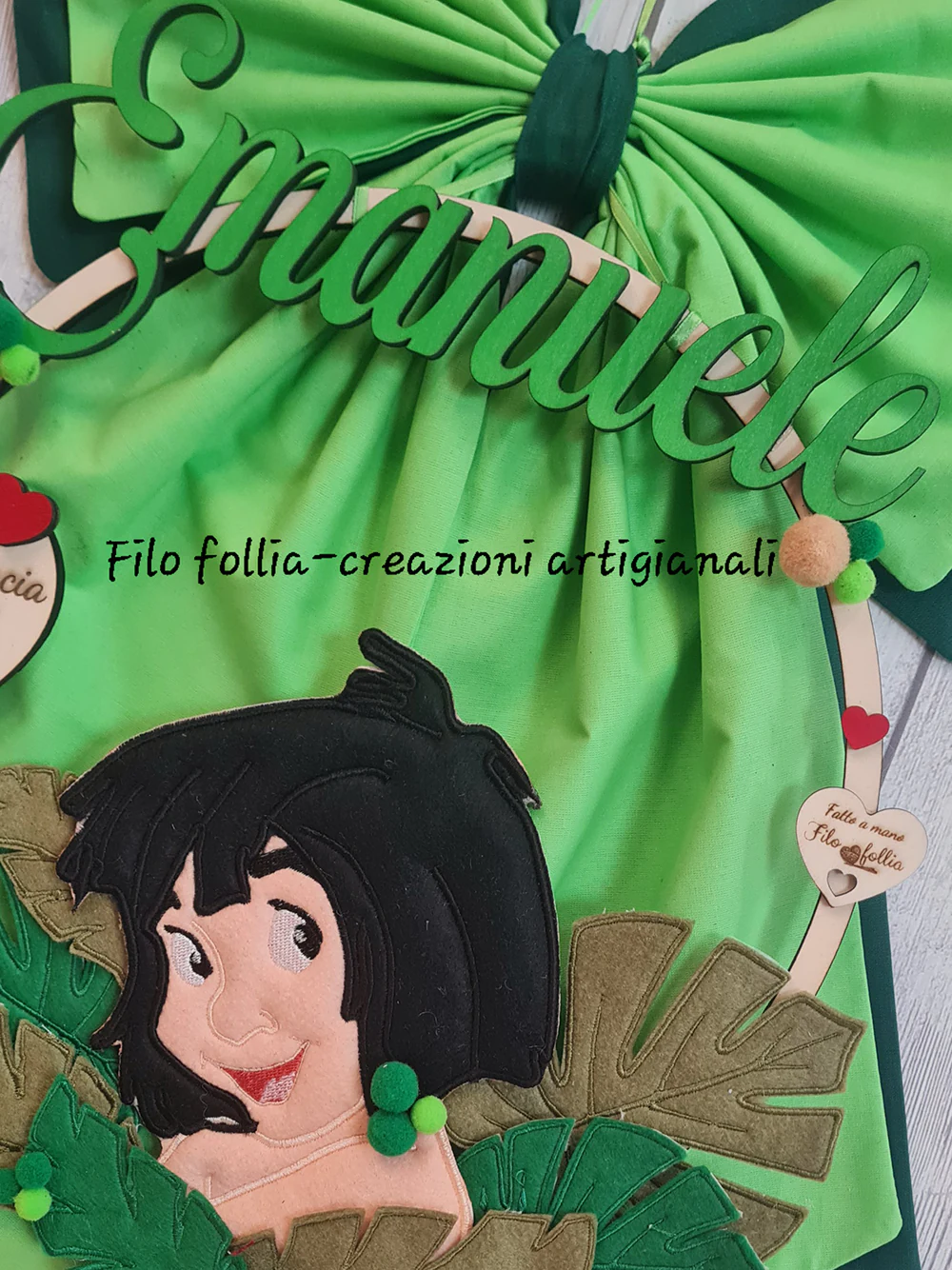 FIOCCO NASCITA TEMA MOWGLI realizzato in pannolenci e legno con retro in STOFFA. Creato interamente a mano. Personalizzabile con nome e dedica per ogni esigenza.