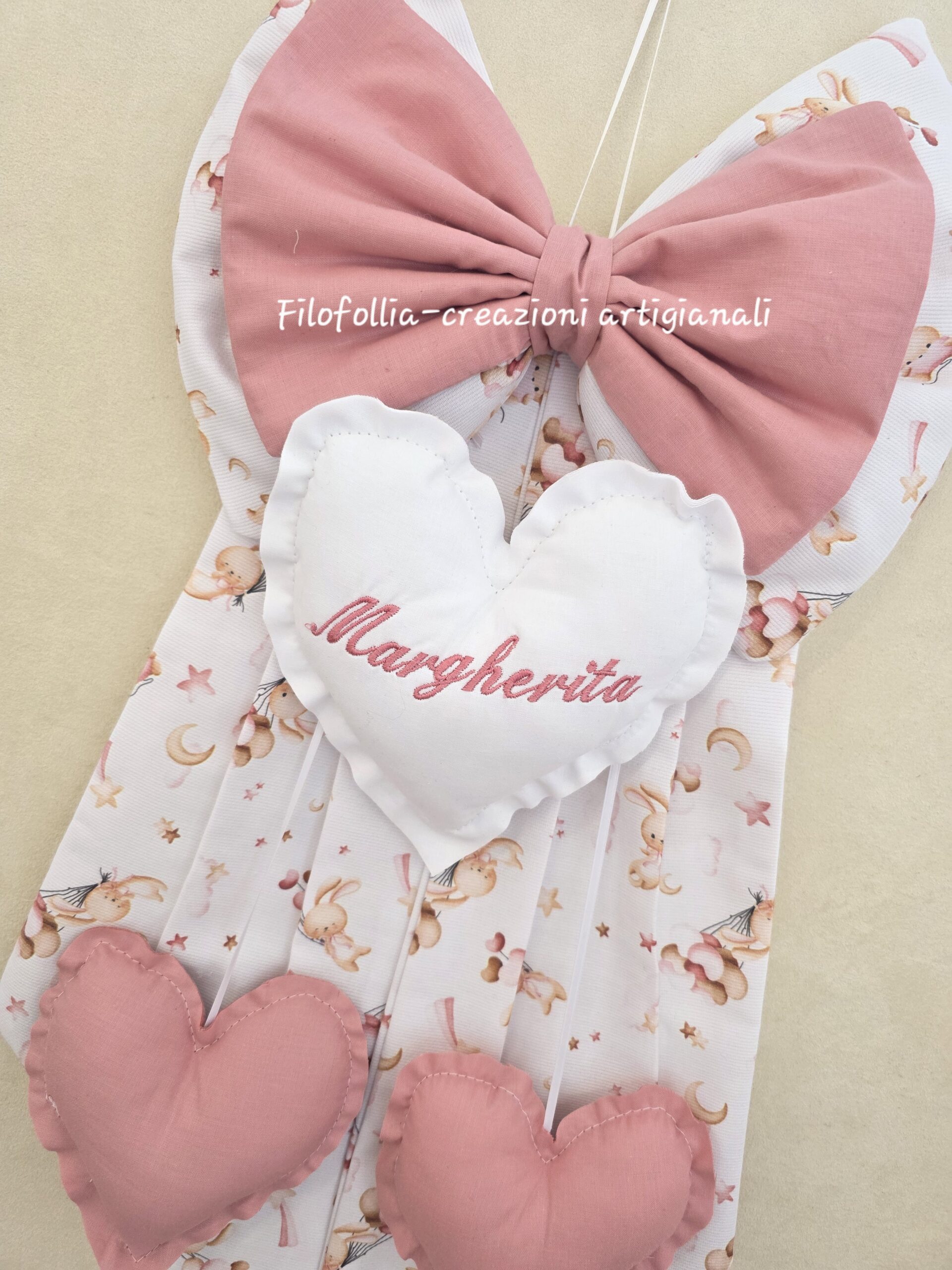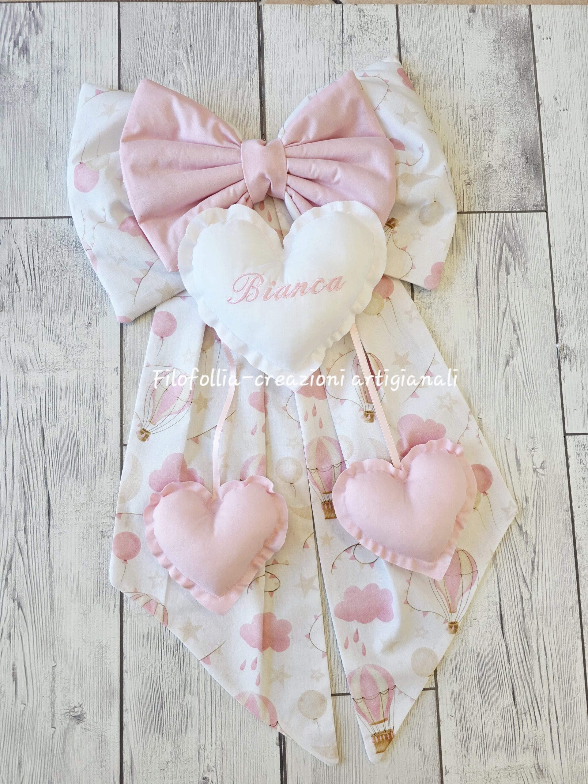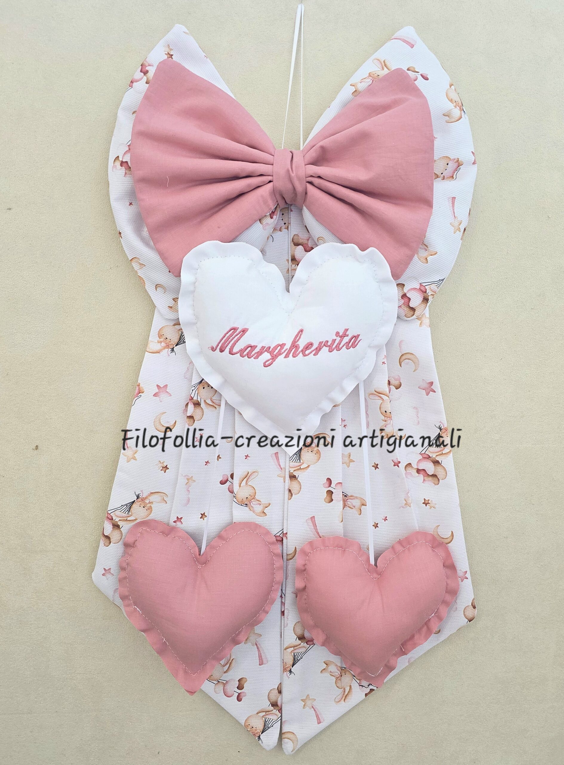 Fiocco nascita interamente realizzato a mano, caratterizzato da un design multistrato e un'armoniosa combinazione di texture e tonalità delicate. Cotone di alta qualità. Cuore centrale imbottito con nome ricamato a macchina e due pendenti.