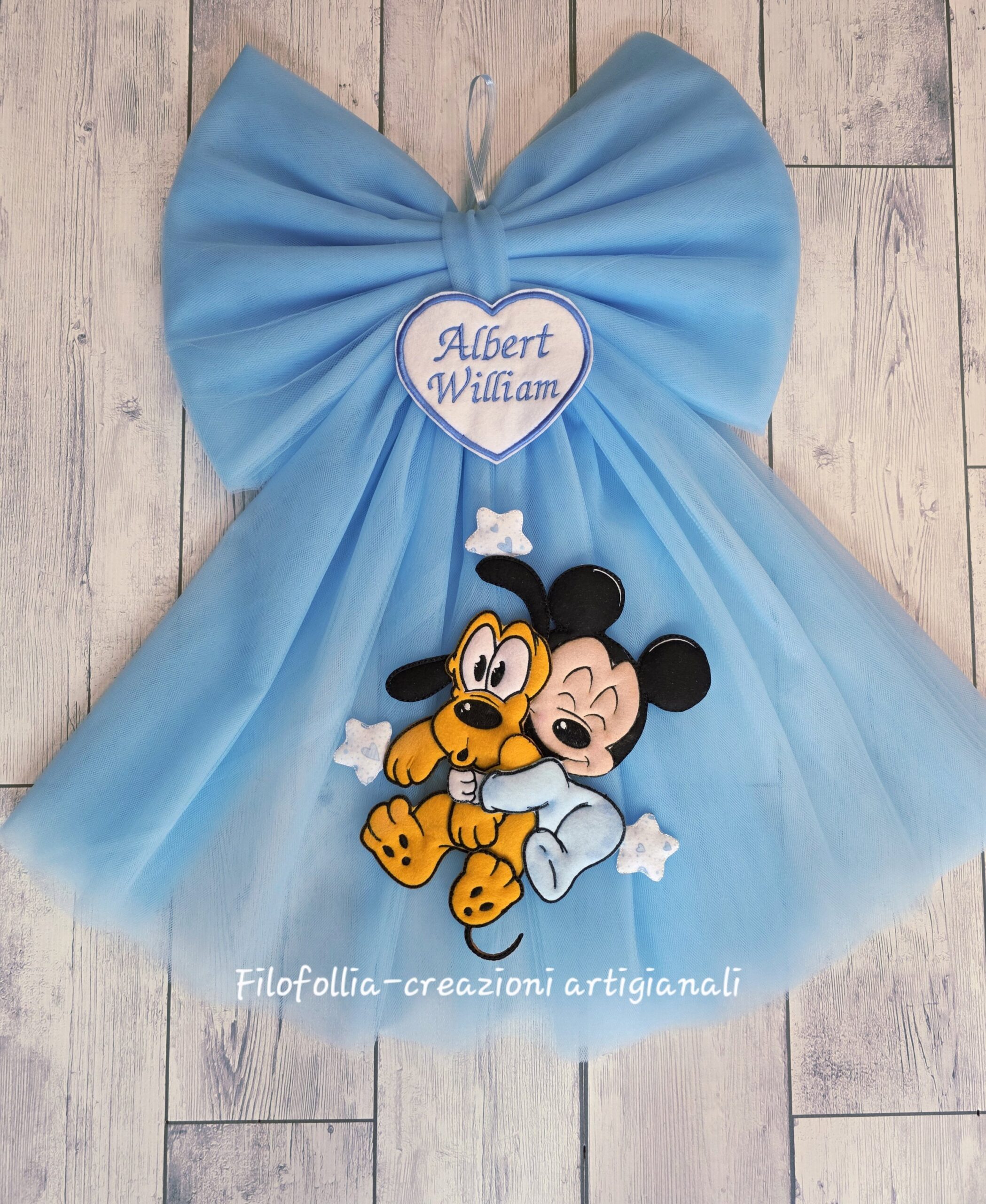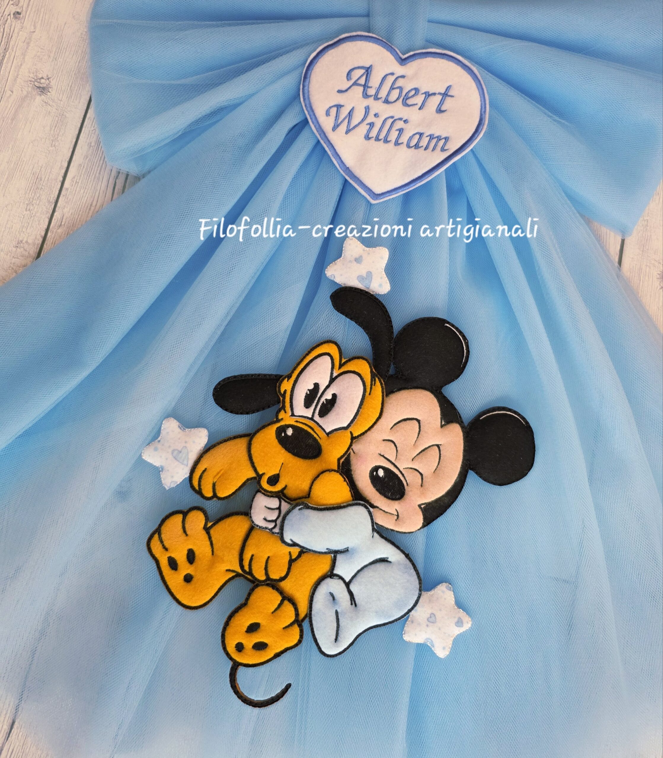 Fiocco nascita interamente realizzato a mano che unisce la leggerezza del tulle alla consistenza morbida del pannolenci. Al centro Topolino e Pluto circondati da piccole stelle imbottite. Il nome è ricamato al centro di un cuoricino.