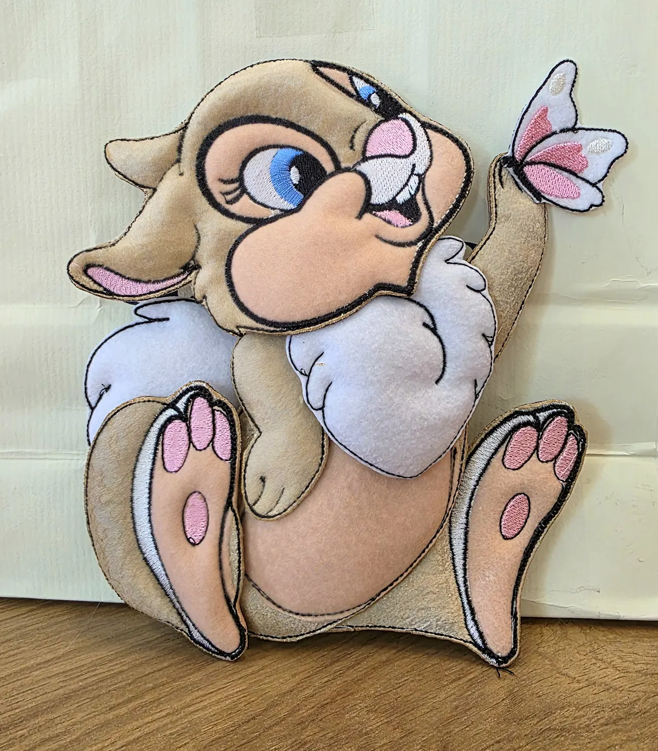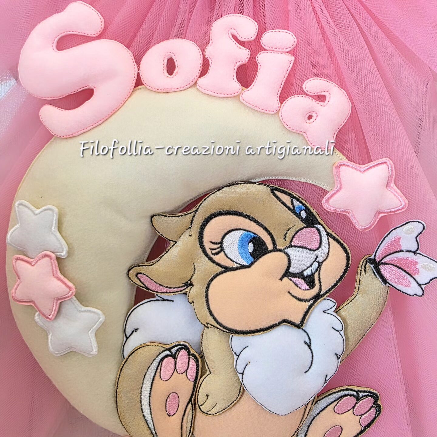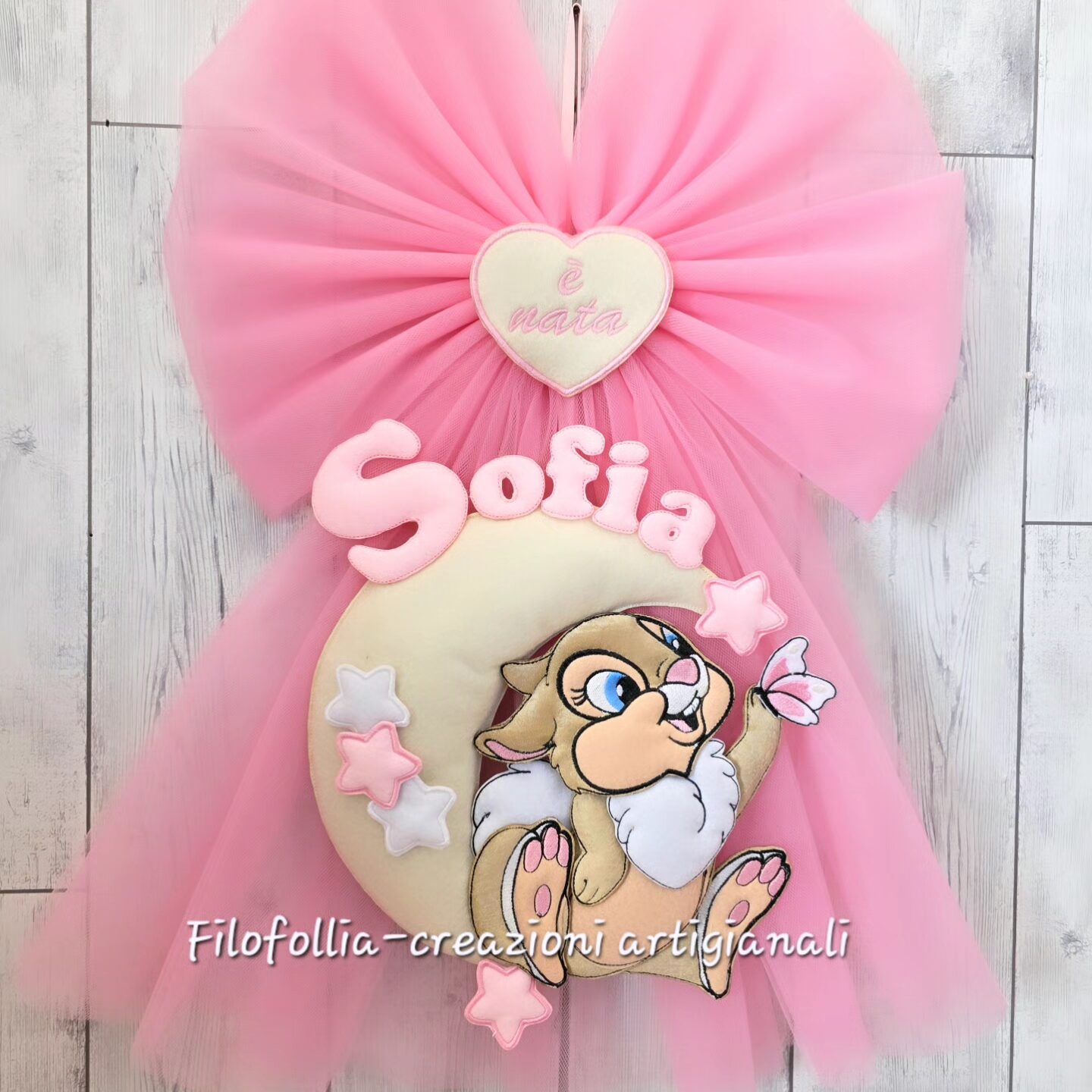 Fiocco nascita interamente realizzato a mano che unisce la leggerezza del tulle alla consistenza morbida del pannolenci. Al centro spicca una tenerissima Miss Bunny la celebre coniglietta che fa innamorare Tamburino di Bambi, posto su una luna circondata da piccole stelle imbottite. Il nome è applicato lungo la curvatura della luna con lettere imbottite. Il cuore pendente riporta la scritta ricamata "è nata", completando l'annuncio con eleganza.