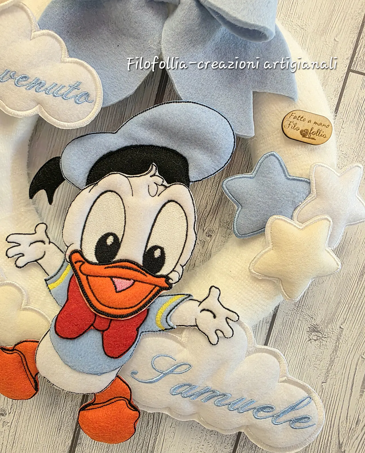 FIOCCO NASCITA composto da una ghirlanda rivestita da pannolenci bianco e decorata con nuvole ricamate a macchina e stelle azzurre bianche e panna. Al centro l’iconico Paperino pronto a dare il benvenuto al piccolo. Ideale per annunciare la nascita, decorare la cameretta o come regalo originale per un baby shower a tema Disney.