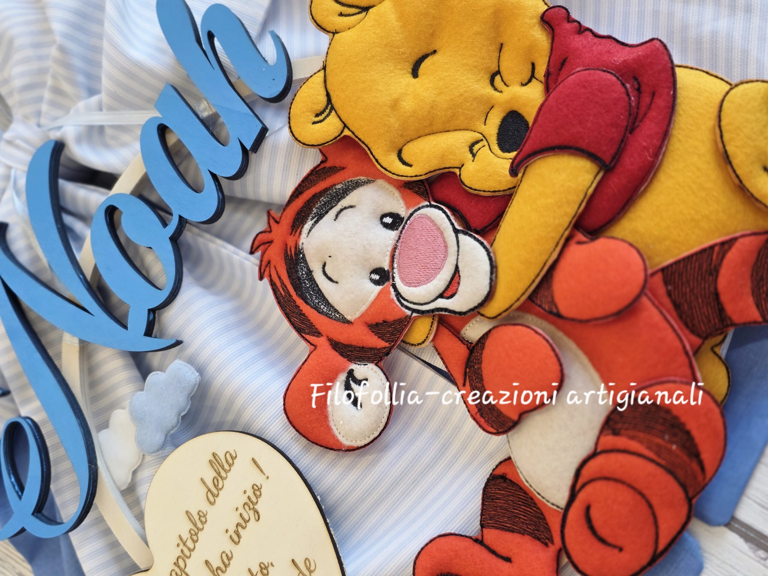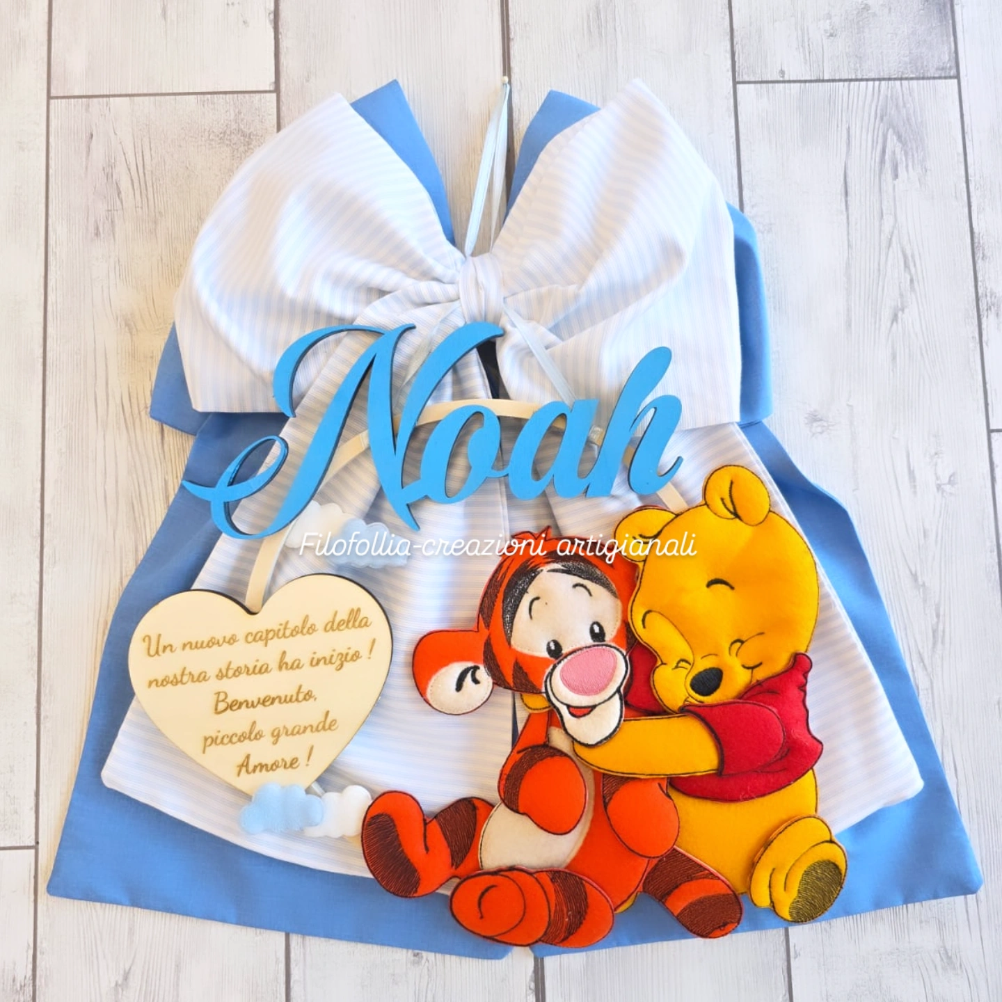 Fiocco nascita interamente realizzato a mano. Perfetto per chi cerca un annuncio che combini la morbidezza del tessuto alla modernità del taglio laser su legno. Base sui toni dell'azzurro per donare luminosità, cuore in legno con dedica, doppio personaggio in pannolenci. Ideale per annunciare la nascita, decorare la cameretta o come regalo originale per un baby shower.