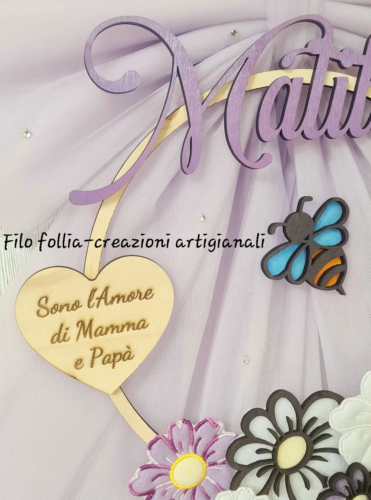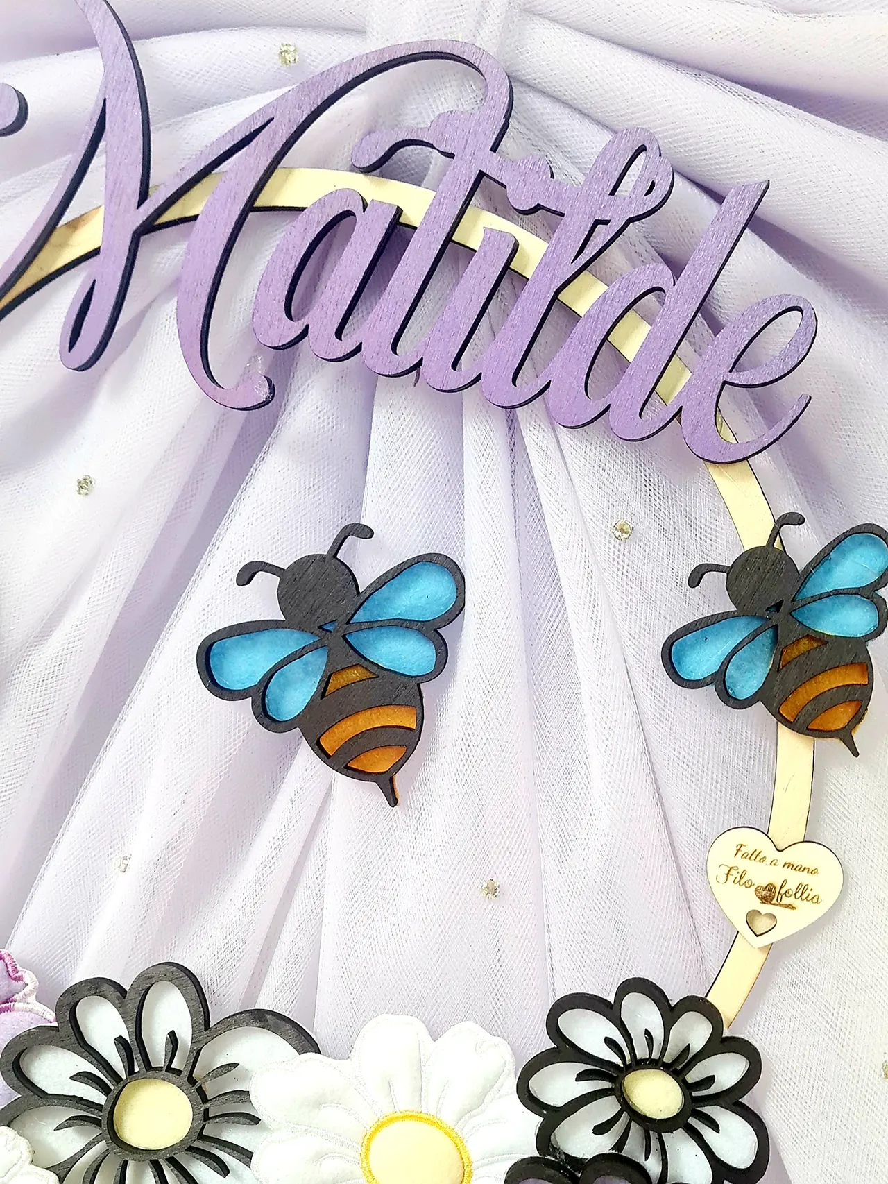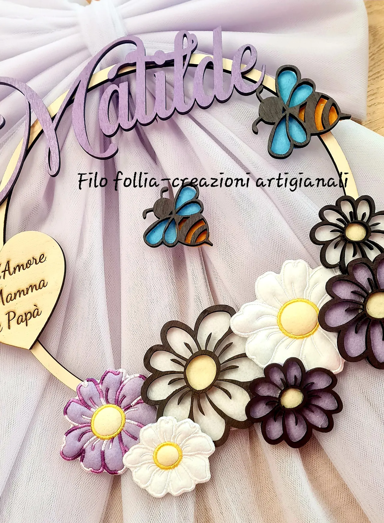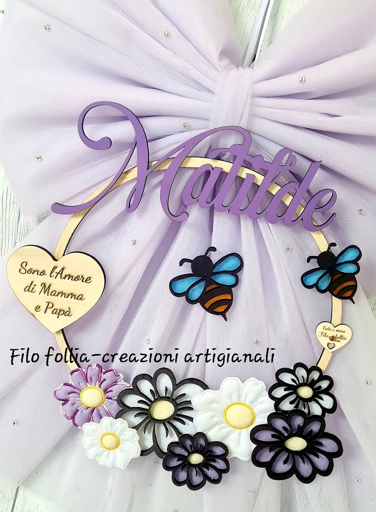 FIOCCO NASCITA TEMA PRIMAVERA realizzato in pannolenci e legno con retro in tulle. Creato interamente a mano. Personalizzabile con nome e dedica per ogni esigenza.