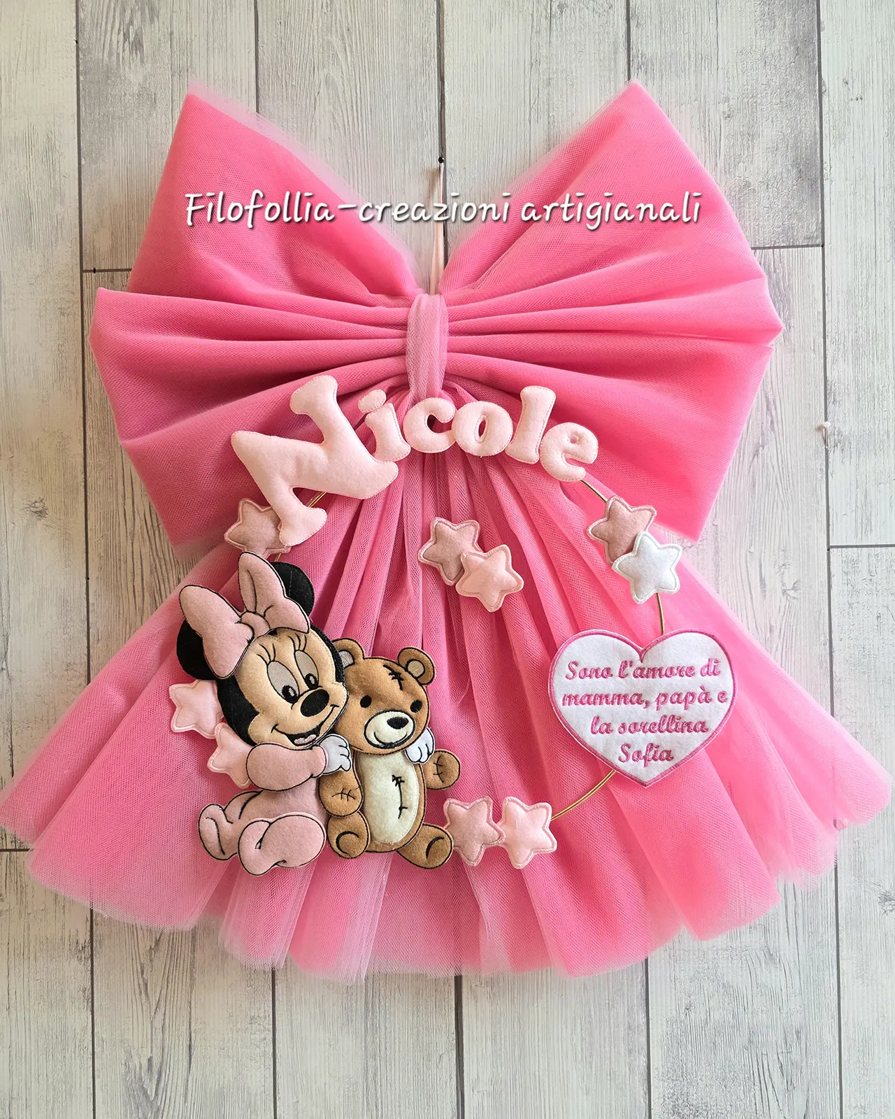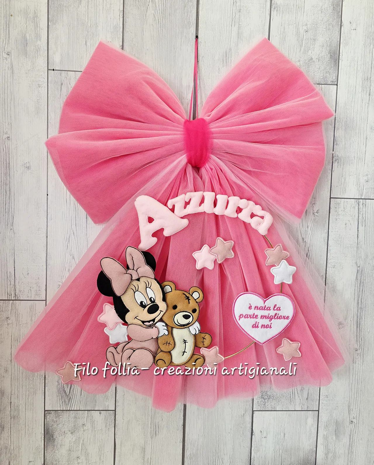 Questa magnifica creazione artigianale combina la dolcezza di Minnie Baby con l’eleganza di un maxi fiocco in tulle vaporoso, perfetto per una vera principessa. La tenera Minnie che abbraccia il suo orsetto è realizzata in pannolenci ed è accompagnata da un cuore con dedica a tua scelta e delle morbidissime stelline. Ideale per decorare la porta di casa o dell’ospedale e conservare un prezioso ricordo di questo giorno indimenticabile.