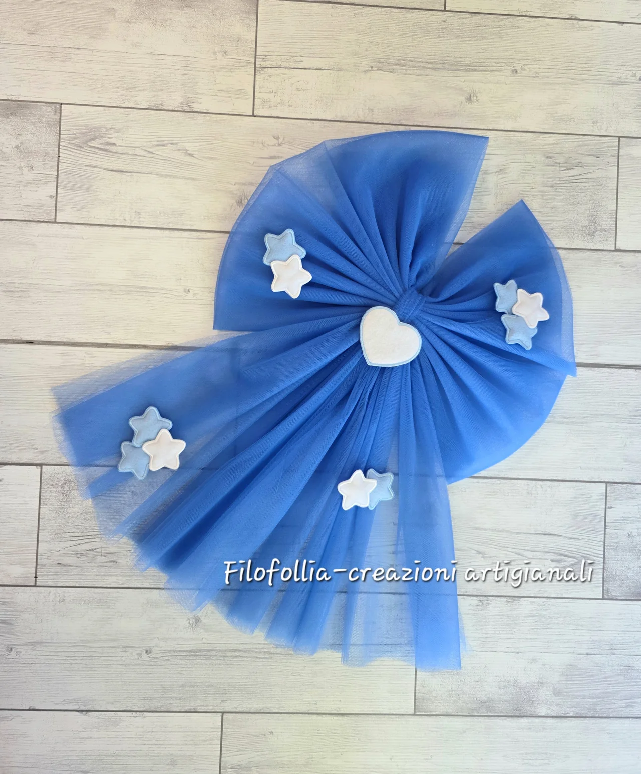 FIOCCO NASCITA TULLE con cuore personalizzato in pannolenci e con morbide stelle imbottite per dare un tocco di vivacità e colore. Creato interamente a mano.