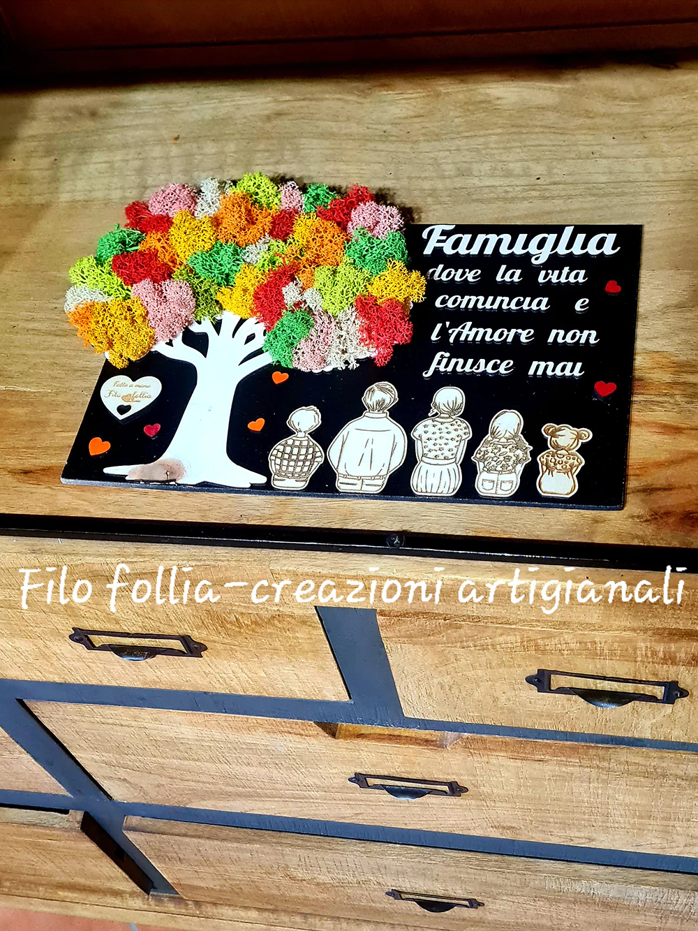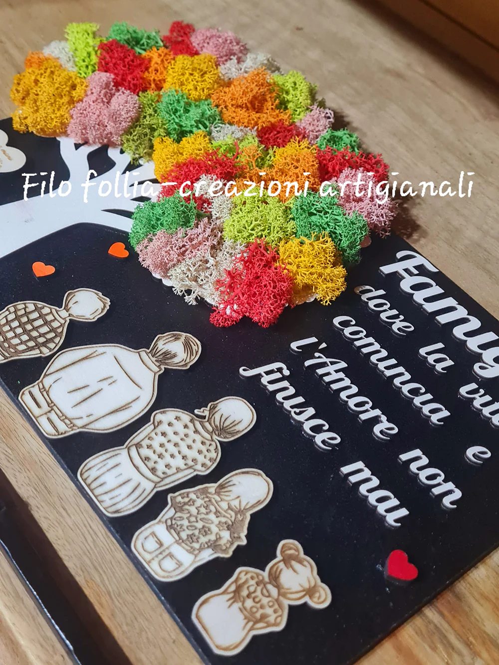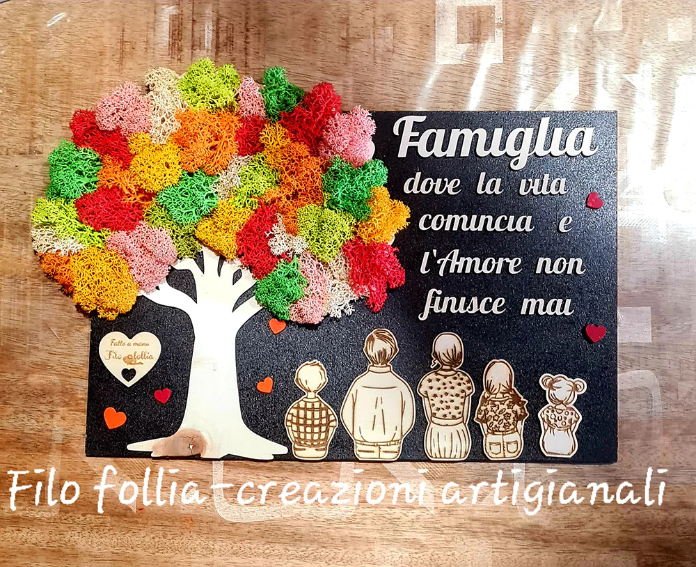 Quadro rotondo di circa 30 cm x 20 cm di h in legno, arricchito dai colori del verde stabilizzato . Un regalo che rimarrà per sempre come ricordo della vostra famiglia!