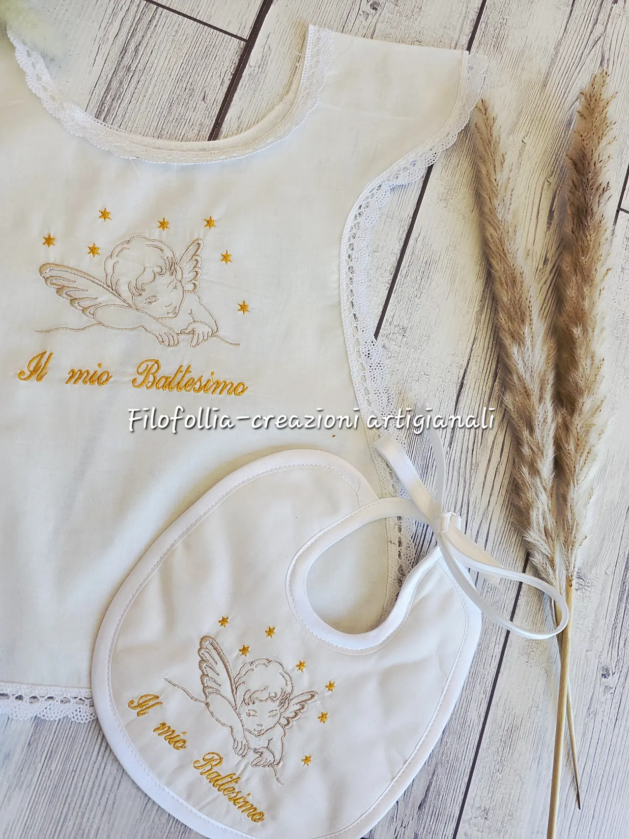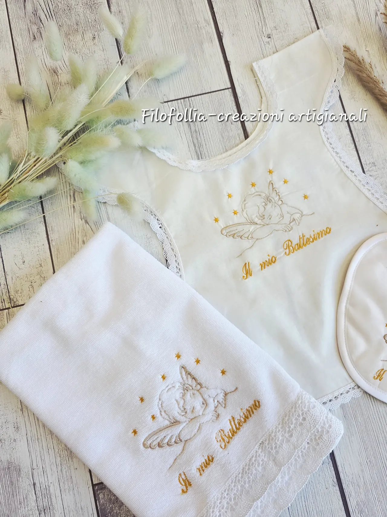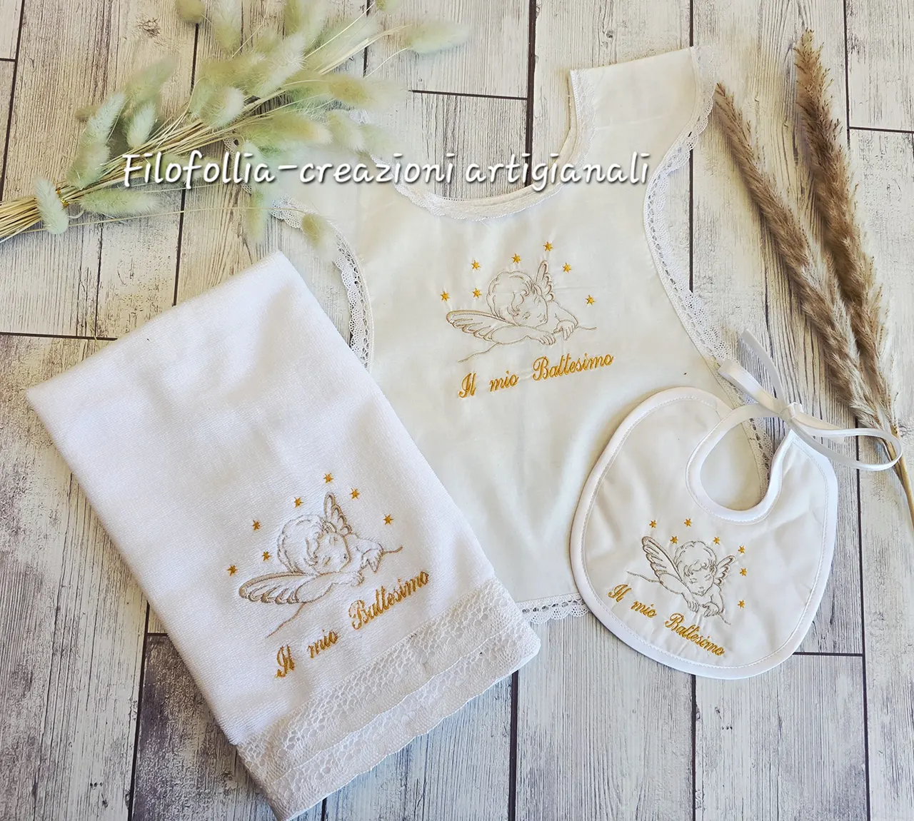 SET BATTESIMALE ARTIGIANALE composto da vestina in 100% cotone, asciugamano in morbidissima spugna bamboo e bavetta in cotone con retro trapuntato. Il set è realizzato interamente a mano, rifinito in pizzo elegante lungo il bordo, ricamo in filo dorato dell’angelo custode. La vestina può essere personalizzata con il nome del bambino e la data della cerimonia. Un regalo unico e prezioso per un giorno importante.
