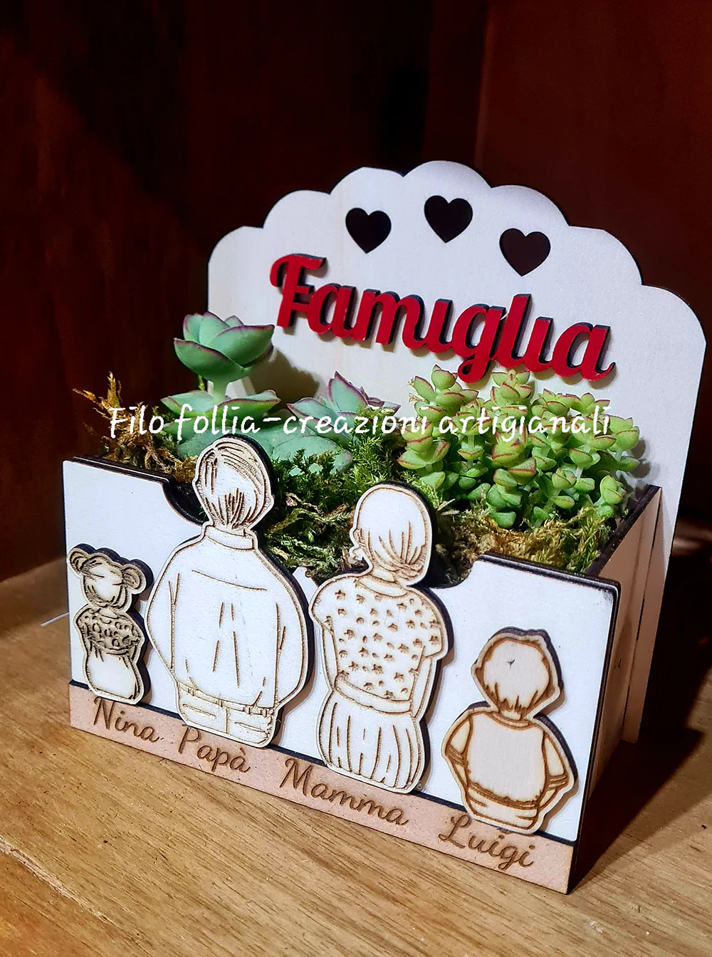 VASETTO FAMIGLIA realizzato in legno di pioppo con incluse due piantine grasse. Creato interamente a mano.
